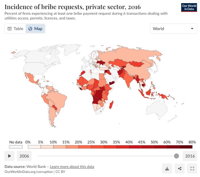 Bribery is (of course) real–but it’s not endemic everywhere. Our World in Data pulled World Bank Enterprise Surveys on the incidence of bribe requests. In some countries, bribery does appear extremely common: In Liberia, roughly 70% of firms experienced at least one bribe request during six transactions. In Cambodia, that figure was 64%--in the Democratic Republic of Congo it was 56%. But the incidence was quite low in other emerging markets: 11% in Senegal, 9% in Namibia, 8% in Botswana. Peter Sullivan, the managing director and head of public sector for Africa at Citi, said he only remembers a single instance of being asked for a payout in 20 years of doing business on the continent.